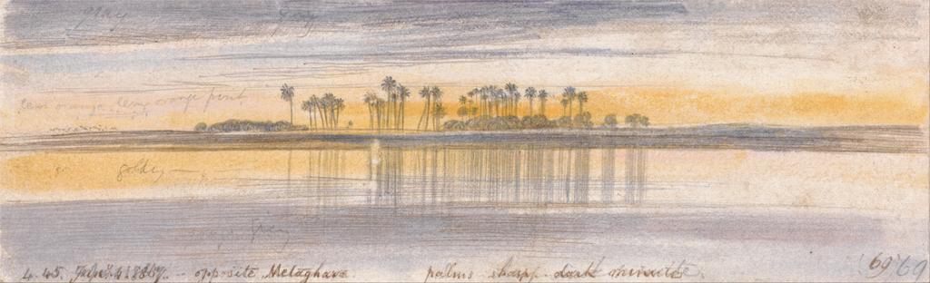 Keywords: Edward Lear - Opposite Melaghara - Google Art Project.jpg inscribed in brown ink lower left 4 45 Jany 4 1867 - opposite Melaghava ; in brown ink lower right 69 ; Verso in graphite upper left 14 up next below Top 79 B Not on View Watercolor with pen in brown and blue ink and white gouache over graphite on moderately thick slighly textured cream wove paper sky palm trees water river landscape special url_id HgG--4gP7xx68A PD-old-100-1923 1888 Egypt by Edward Lear Google Art Project works by Edward Lear |