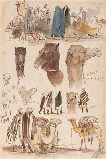 | Keywords: Edward Lear - Outside the Walls of Suez, 8-30 a.m., 17 January 1849 (54) - Google Art Project.jpg Inscribed with pen in brown ink over graphite lower left 8 -/2 a m Jan 17 1849 ; in brown ink center right outside the walls of Suez ; in brown ink over graphite lower right 54 ; Verso in graphite lower center D Gallup ; in graphite upper right 41 Inscription _Signed_and_Dated Not signed not dated Not on View Watercolor with pen in brown ink over graphite on medium slightly textured cream wove paper animal art camels mammals figure illustration robes harnesses saddles studies visual works genre subject tassels special url_id dwHmBL4g_CflyQ PD-old-100-1923 1888 Egypt by Edward Lear Google Art Project works by Edward Lear 1849 in Egypt Camels in art Culture of Egypt History of Suez Bedouins in Egypt |