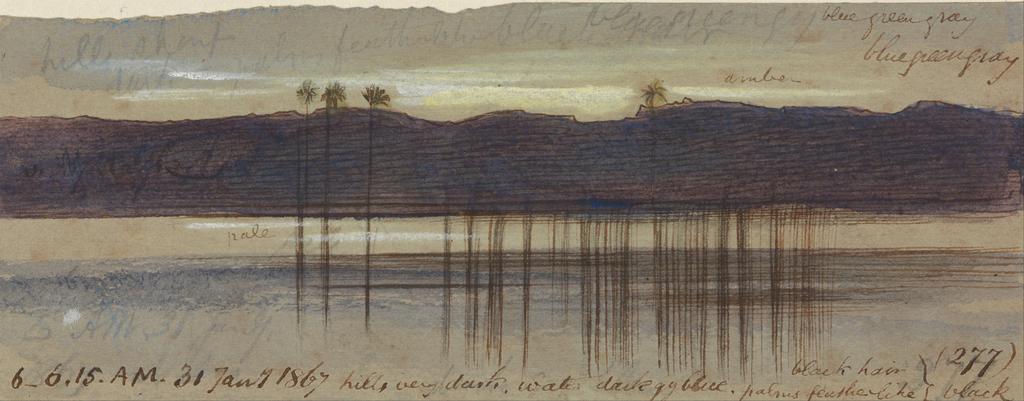 | Keywords: Edward Lear - Philae, 6-00-6-15 am, 31 January 1867 (277) - Google Art Project.jpg Inscribed in brown ink lower left 6-6 15 AM 31 Jany 1867 hills very dark water darkly blue black hair palms feather like 277 black ; in brown ink upper right blue green gray blue green gray Not on View Watercolor with pen in brown ink over graphite on moderately thick moderately textured gray wove paper reflection sunrise palm trees water river landscape special url_id XwE5Owv5vdePEw PD-old-100-1923 1888 Egypt by Edward Lear Philae in art Google Art Project works by Edward Lear |