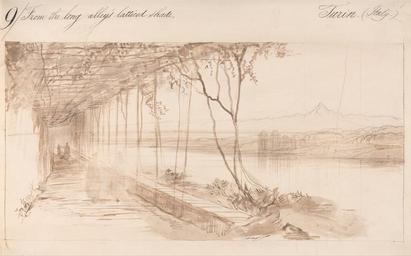 | Keywords: Edward Lear - Turin, Italy - Google Art Project.jpg Inscribed in black ink upper left 9/ From the long alley's latticed shade ; in black ink upper right Turin Italy ; Verso in graphite upper left 5834 Lear Inscription _Marks Watermark J Whatman / 1872 Not on View Pen in brown ink with brown wash over graphite on moderately thick moderately textured cream wove paper stone barrier river mountains vegetation vines buildings trellis path figures representations landscape special url_id PQHVpdViNT81OA PD-old-100-1923 1888 Drawings by Edward Lear Google Art Project works by Edward Lear |