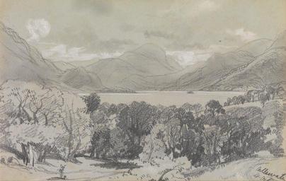 | Keywords: Edward Lear - Ullswater, 14 Oct. 1836 - Google Art Project.jpg Inscribed in graphite lower right Ullswater 14 Oct ; Verso in graphite center 10 Not on View Graphite with stumping and white gouache on moderately thick moderately textured gray-green wove paper sky lake mountains hills trees figure representation landscape special url_id EAGCLaNxZBE8Ng PD-old-100-1923 1888 Drawings by Edward Lear Google Art Project works by Edward Lear | ||||