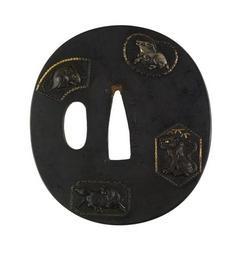 | Keywords: Egawa Toshinari - Tsuba with Animals from the Chinese Zodiac - Walters 51275.jpg The Chinese zodiac which is also used in Japan assigns an animal to each year There are twelve animals in total six of which are depicted on this tsuba The other six animals were probably used to decorate other sword fittings used with the tsuba Each animal is placed within its own cartouche On the front of the tsuba are a rat a goat a tiger and a horse On there reverse are a snake and an ox ca 1800 1825 late Edo nigurome gold shibuichi shakudo copper cm 6 9 6 4 0 35 accession number 51 275 36580 Henry Walters Baltimore date and mode of acquisition unknown Walters Art Museum Henry Walters Acquired by Henry Walters Signature Egawa Toshio place of origin Japan Walters Art Museum license Tsuba in the Walters Art Museum Egawa Toshinari Media contributed by the Walters Art Museum needs category review |