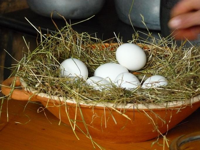 Keywords: egg chicken eggs white eggs eggs on straw clay bowl container straw hay agriculture dried grass food nutrition eat chicken product