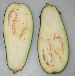 | Keywords: Eggplant-sliced.jpg An eggplant probably Solanum melongena sliced in half with the insides facing up on a cutting board Although taken just a few moments after slicing the flesh of the eggplant has already begun to oxidize a little Although much of the flesh is smooth many seeds can be seen at the widest part of the eggplant In the eggplant there are almost no seeds at the top but they become plentiful at the bottom Source My kitchen self-made Photographer/Painter Kit O'Connell Todfox 08 04 13 December 2005 UTC Eggplant Photos by Todfox 2005-12-13 own assumed Todfox~commonswiki Cross sections of vegetables |