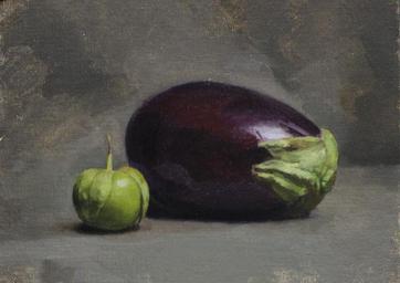 Keywords: Eggplant and Tomatillo, Oil on canvas 9 x 12 inch art-call Artistically