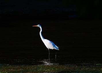 Keywords: egret birds white herons wildlife alone single isolated great egret water lake pond standing dark background nature