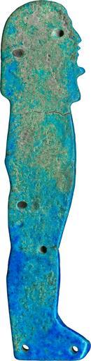 Keywords: Egyptian - Amuletic Figure of Imsety, Son of Horus - Walters 481640 - Reverse.jpg This faience amulet represents Imsety the human-headed son of Horus There are four sons of Horus and this amulet is part of a set of four Walters 48 1638-1641 The sons of Horus protected the vital organs of the body after mummification The figure faces proper right It is composed of blue glazed faience with the details picked out in purple/black manganese The figure wears a three row broad collar a tripartite wig and a divine beard There are five diagonal stripes of manganese across the mummiform body representing the mummy wrappings or braces Numerous funerary amulets were usually placed among the many layers of linen strips used to wrap mummies Specific amulets along with their required position on the body are listed in funerary texts such as The Book of the Dead Amulets were sometimes sewn directly onto the wrappings or could be incorporated into a bead net shroud covering the mummy These amulets have been modeled with a flat underside and are pierced by tiny holes around the edges for attachment ca 750 650 BC Third Intermediate Egyptian faience with blue and black glaze cm 9 2 2 2 0 7 accession number 48 1640 17438 Henry Walters Baltimore date and mode of acquisition unknown Walters Art Museum Henry Walters Acquired by Henry Walters Jewelry - Ancient to Modern The Walters Art Gallery Baltimore 1979-1980 Objects of Adornment Five Thousand Years of Jewelry from the Walters Art Gallery Baltimore Cooper-Hewitt National Design Museum New York; Chrysler Museum of Art Norfolk; Carnegie Museum of Art Pittsburgh; San Antonio Museum of Art San Antonio; Philbrook Museum of Art Tulsa; Honolulu Academy of Arts Honolulu; New Orleans Museum of Art New Orleans; Milwaukee Art Museum Milwaukee; Minneapolis Institute of Arts Minneapolis; Toledo Museum of Art Toledo; The John and Mable Ringling Museum of Art Sarasota 1984-1987 Jewelry from the Walters Art Museum and the Zucker Family Collection The Walters Art Gallery Baltimore 1987 Faience The Colors of the Heavens The Walters Art Museum Baltimore; The Walters Art Museum Baltimore 2003-2004 place of origin Egypt Walters Art Museum license Ancient Egyptian amulets in the Walters Art Museum Imset Ancient Egyptian faience in the Walters Art Museum Media contributed by the Walters Art Museum needs category review |
