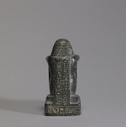 | Keywords: Egyptian - Block Statue of Kha-em-Waset - Walters 2268 - Back.jpg This piece is a small serpentine New Kingdom block statue of Kha-em-Waset Kha-em-Waset was a noble who held the titles of Fan-Bearer and Chief of Works in the Temple of Amun This statue would have been placed as a votive in the temple of Amun Kha-em-Waset sits with his knees drawn up upon a rectangular bench which in turn rests upon a rectangular base The back right corner of the base is missing There is a rectangular back plinth behind him He wears a long smooth ankle-length garment The outlines of his legs are visible in profile and his arms are visible within the garment as well His arms are folded and hands rest flat upon his upper arms An insignia on his upper right arm identifies him as belonging to the Temple of Amun There are two vertical columns of hieroglyphics text on the front of his garment and on the back plinth A single horizontal band of text surrounds the base His wig is a New Kingdom combination of delicate wavy strands over plaited curls His eyes are large and recall the orientalized almond-shaped eyes of Amenhotep III His lips are thick and form a slight smile His ears are unusually pointed He has a short squared beard ca 1370 1360 BC New Kingdom black serpentine cm 8 6 4 1 6 1 accession number 22 68 17604 Dikran Kelekian New York and Paris Henry Walters Baltimore date of acquisition unknown by purchase Walters Art Museum Henry Walters Acquired by Henry Walters Translation All things which go forth on the offering table of Amun lord of coolness and dryness for the fan-bearer Kha-em-Waset; Translation The true admirable one of good character of kindly manners who is not negligent the fan bearer of the troop Beautiful is the yeomanry Kha-em-Waset; Translation An offering which the king gives to Amun-Re King of the gods that he may give a good life to him who is devoted to him and puts himself upon his face the fan-bearer Kha-em-Waset An offering which the king gives to Amun-Re lord of coolness and dryness that he may give a good life in following him until he reaches the age in goodness to the fan-bearer Kha-em-Waset //// the Chief of the works in the Temple of Amun Mark Temple of Amun place of origin Temple of Amun-Re in Karnak Egypt Walters Art Museum license Ancient Egyptian block statues in the Walters Art Museum Statues of the 19th dynasty of Egypt Statues from Karnak temple complex |