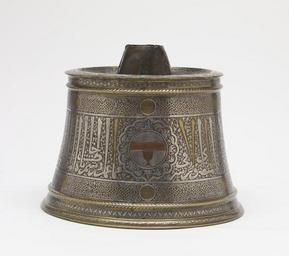| Keywords: Egyptian - Candlestick Base - Walters 54459 - View A.jpg Throughout Islamic history sultans princes and court officials have been active art patrons This impressive candlestick base was commissioned by Zayn al-Din Kitbugha who served as saqi or cupbearer at the court of the Mamluk Dynasty in Egypt before ascending the throne in 1294 The large inscription in thuluth script around the candlestick's body is punctuated by roundels featuring a stemmed cup Kitbugha's blazon or heraldic shield Calligraphy is also a major decorative element In addition to the large thuluth inscription this piece includes different sizes and styles of Arabic script Despite its elaborate design Kitbugha had the candlestick made for use in his household storeroom or pantry The candlestick's neck and socket- today in the Museum of Islamic Art Cairo- already had been removed when Mr Walters added the piece to his growing collection of Islamic art ca 1290 Mamluk; Bahri brass with silver gold and copper inlays cm 26 5 32 5 accession number 54 459 15804 Dikran Kelekian New York and Paris Henry Walters city Baltimore Walters Art Museum Henry Walters Acquired by Henry Walters 1925 Transcription Inscribed base and neck Zayn al-Din Kitbugha; Translation Inscribed base in thuluth script This is one of the things made for the servery of the lofty authority the lordly the great amir the conqueror the holy warrior the just al-Zayni Zayn al-Din Kitbugha al-Mansuri al-Ashrafi of the households of the sultans Qalawun and Khalil The Arts of Islam Hayward Gallery London 1976 Renaissance of Islam Art of the Mamluks Smithsonian National Museum of Natural History Washington; Minneapolis Institute of Arts Minneapolis; The Metropolitan Museum of Art New York; Cincinnati Art Museum Cincinnati; The Detroit Institute of Arts Detroit; Crocker Art Museum Sacramento; San Diego Museum Of Art San Diego; Phoenix Art Museum Phoenix; Wadsworth Atheneum Museum of Art Hartford 1981-1983 Highlights from the Collection The Walters Art Gallery Baltimore 1998-2001 place of origin Egypt Walters Art Museum license Islamic metalwork in the Walters Art Museum Media contributed by the Walters Art Museum needs category review Metalwork of Egypt Al-Adil Kitbugha |