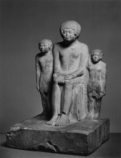 | Keywords: Egyptian - Family Group of Three - Walters 22112.jpg This sculpture depicts a family group of three At the center is a seated male figure wearing a shendyt The figure's right hand is clenched on his knee and his left hand is open on his knee His hair is in rows of rectangles On his right a standing boy is wearing a short shendyt with hair as his fathers On his left is a standing boy wearing a shendyt with his hair in a braid On top of the base is an inscription ca 2500 1793 BC late Old-Middle Kingdom limestone cm 48 3 accession number 22 112 28802 Navare date and mode of acquisition unknown claims Ancient Empire Found at the Pyramids of Giseh Henry Walters Baltimore 1929 mode of acquisition unknown Walters Art Museum Henry Walters Acquried by Henry Walters 1929 Inscription place of origin Egypt Walters Art Museum license Ancient Egyptian statues in the Walters Art Museum Braids in art |