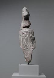| Keywords: Egyptian - FIgure of Ramesses II From a Group Statue - Walters 22114 - Back.jpg King Ramesses II wears a headdress combining the royal nemes head cloth with the double-crown of Upper and Lower Egypt Note the king's royal beard considered to be an attribute of the gods Kings wore false beards held in place by a cord to portray themselves as living gods The inscribed belt buckle contains the hieroglyphs forming his throne name User-Maat-Re Setep-en-Re The king would have had five names in total this name and three others acquired when he assumed the throne and Ramesses his birth name To his right another figure was once placed most likely a god or goddess ca 1250 BC New Kingdom Aswan granite or peridotite cm 44 5 14 9 5 ; H including base cm 53 5 accession number 22 114 10112 Dikran Kelekian New York and Paris date and mode of acquisition unknown Henry Walters city Baltimore Walters Art Museum Henry Walters Acquired by Henry Walters 1925 place of origin Upper Egypt Walters Art Museum license Ancient Egyptian statuettes in the Walters Art Museum Statues of Ramses II Cartouches of Ramses II |