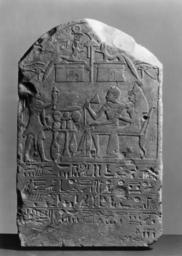 | Keywords: Egyptian - Funeral Stele - Walters 22155.jpg This piece is a rectangular round-topped stela its images carved in low raised relief while it's inscription is carved in sunk relief It depicts the deceased and his wife seated before an offering table facing to the left The male wears a collar and a long shendyt and has a shaved head while his wife wears a long narrow strapless garment and an elaborate wig surmounted with a cone of fat He holds a lotus blossom to his nose while his wife places her hands on him in a loving gesture On the opposite side of the table is a sem-priest holding a closed Hst water -vase Above these three people in the curved portion of the stela is a symmetrical image two recumbent Anubis-jakals one has Inp- Anubis written above his back each sitting upon a shrine facing each other Between them is the hieroglyph for imnt -meaning the West i e the Necropolis Behind each of the jackals is a wDAt -eye and above the left jackal is preserved a Sn hieroglyph symbolizing protection on top of a cup/basket hieroglyph There are remnants of red and black pigment on the stela The stela was broken into two large fragments and the top right corner is broken off; large metal staples and plaster have been added There is an odd-looking divot between the back of the female and the back of the chair between 1400 1350 BC New Kingdom limestone cm 56 accession number 22 155 37617 Dikran Kelekian New York and Paris date and mode of acquisition unknown claimed from Abydos Henry Walters city Baltimore Walters Art Museum Henry Walters Acquired by Henry Walters 1913 Transcription Text damaged during conversion 1 htp di ny-swt wsir nb ddw ntrw nbw dt di sn 2 ax m pp sic xr ra wsr m ta pa sic xr gb maa-xrw m 3 xrt-ntr xr wsir qb m irp irtt ssp 4 n pw sbw/dfaw m r-staw iw xtxt m-bah nbw hr sms ka tawyw sic ra nb 5 n sic xr; Translation An offering which the king gives to Osiris lord of Busiris and the gods the lords of eternity so that they may give - being glorious in heaven before Re powerful on the earth before Geb and justified in the necropolis before Osiris - cold water with wine and milk receiving food-offerings in Ro-Setau coming and going in the presence of the lords following the ka of the two lands everyday to the Secret Signs Egyptian Writing The Walters Art Museum Baltimore 2003-2004 place of origin Thebes present-day Luxor Egypt Walters Art Museum license Wine in ancient Egypt Ancient Egyptian reliefs in the Walters Art Museum Media contributed by the Walters Art Museum needs category review |