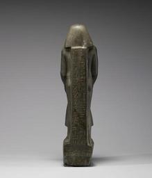 | Keywords: Egyptian - Iret-horru with Osiris - Walters 22215 - Back.jpg In ancient Egypt political upheavals accompanied by changes in religious practices were often an occasion for innovations in private sculpture This was especially evident in the early 18th Dynasty when new statue types representing the donor holding a naos or a sistrum among other objects came into use for the first time The representation of a donor depicted standing seated kneeling or squatting proffering the figure of a deity or a sacred object ensured the donor's eternal participation in the rituals undertaken in the gods' presence Representations of the ritual interaction between men and gods were even more highly sought when the high priests of Amun seized power in Thebes during in the 21st Dynasty and ruled the country's south From this point onward over a period of several centuries statues depicting the donor squatting or holding the image of a god were almost the only statue types dedicated in extraordinary numbers in the temple of Amun at Karnak The vast extent of these dedications was attested early in the 20th century when the French architect Georges Legrain discovered a cache of nearly eight hundred stone statues and seventeen thousand bronzes as well as other artifacts buried in the courtyard of the temple of Amun in front of the 7th pylon The standing figure of the priest Iret-horru was one of these statues-the largest Egyptian statue hoard ever recorded-ritually buried by temple priests in the Ptolemaic period to relieve the crowding of more than two thousand years of private offerings Iret-horru holds the mummified figure of Osiris the god of the netherworld outfitted in his traditional regalia the tall Atef-crown and crook and flail The priest himself wears a wide wig with narrow striations and ankle-length pleated garment with a prominent trapezoidal apron The frontal view exhibits a prominent collarbone and an articulated sternum Despite its awkward proportions the arms in particular are clumsily rendered the statue has a majestic appearance Statues of donors bearing figures of Osiris were among the most popular types of private statuary in the Late Period; this example was dedicated to Iret-horru by his son Necho who also served as a priest in Karnak ca 595 BC Late Period graywacke cm 56 16 accession number 22 215 6796 Sale Egyptian Museum Cairo JE 37890 Dikran Kelekian New York and Paris Henry Walters city Baltimore Walters Art Museum Henry Walters Acquired by Henry Walters 1911 In the Fullness of Time Masterpieces of Egyptian Art from American Collections Hallie Ford Museum of Art Willamette University Salem; Boise Museum of Art Boise 2002-2003 place of origin Egypt Walters Art Museum license Ancient Egyptian statues in the Walters Art Museum Statues of the 21st dynasty of Egypt Statues from Karnak temple complex Ancient Egyptian priests Ancient Egyptian art made from greywacke |