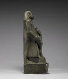 | Keywords: Egyptian - Iret-horru with Osiris - Walters 22215 - Right.jpg In ancient Egypt political upheavals accompanied by changes in religious practices were often an occasion for innovations in private sculpture This was especially evident in the early 18th Dynasty when new statue types representing the donor holding a naos or a sistrum among other objects came into use for the first time The representation of a donor depicted standing seated kneeling or squatting proffering the figure of a deity or a sacred object ensured the donor's eternal participation in the rituals undertaken in the gods' presence Representations of the ritual interaction between men and gods were even more highly sought when the high priests of Amun seized power in Thebes during in the 21st Dynasty and ruled the country's south From this point onward over a period of several centuries statues depicting the donor squatting or holding the image of a god were almost the only statue types dedicated in extraordinary numbers in the temple of Amun at Karnak The vast extent of these dedications was attested early in the 20th century when the French architect Georges Legrain discovered a cache of nearly eight hundred stone statues and seventeen thousand bronzes as well as other artifacts buried in the courtyard of the temple of Amun in front of the 7th pylon The standing figure of the priest Iret-horru was one of these statues-the largest Egyptian statue hoard ever recorded-ritually buried by temple priests in the Ptolemaic period to relieve the crowding of more than two thousand years of private offerings Iret-horru holds the mummified figure of Osiris the god of the netherworld outfitted in his traditional regalia the tall Atef-crown and crook and flail The priest himself wears a wide wig with narrow striations and ankle-length pleated garment with a prominent trapezoidal apron The frontal view exhibits a prominent collarbone and an articulated sternum Despite its awkward proportions the arms in particular are clumsily rendered the statue has a majestic appearance Statues of donors bearing figures of Osiris were among the most popular types of private statuary in the Late Period; this example was dedicated to Iret-horru by his son Necho who also served as a priest in Karnak ca 595 BC Late Period graywacke cm 56 16 accession number 22 215 6796 Sale Egyptian Museum Cairo JE 37890 Dikran Kelekian New York and Paris Henry Walters city Baltimore Walters Art Museum Henry Walters Acquired by Henry Walters 1911 In the Fullness of Time Masterpieces of Egyptian Art from American Collections Hallie Ford Museum of Art Willamette University Salem; Boise Museum of Art Boise 2002-2003 place of origin Egypt Walters Art Museum license Ancient Egyptian statues in the Walters Art Museum Statues of the 21st dynasty of Egypt Statues from Karnak temple complex Ancient Egyptian priests Ancient Egyptian art made from greywacke |