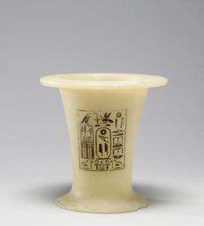 | Keywords: Egyptian - Jubilee Vessel of Pepi I - Walters 4128.jpg The beautiful hieroglyphs on this vessel identify its owner and the ritual in which it was used On the left is King Pepi I's Horus name one of a king's five names Beloved of the Two Lands Egypt At center is his throne name Mery-re; below are brief symmetrical texts reading given life and dominion forever On the right is a text First day of the Sed-festival If an Egyptian king reigned for thirty years he performed a ritual of renewal the Sed-festival in which this vessel would have been used ca 2290 BC Old Kingdom alabaster calcite and pigment bottom cm 14 5 10 7 h x diam ; top cm 14 4 diam accession number 41 28 15119 Dikran Kelekian Paris and New York Henry Walters city Baltimore Walters Art Museum Henry Walters Acquired by Henry Walters 1914 Translation The Horus Mery-tawy Beloved of the Two Lands ; King of Upper and Lower Egypt Mery-re Beloved of Re ; First occasion of the Sed-festival; Given life and dominion forever given life and dominion forever; Translation Right column First of the Sed Festival Middle column King of Upper and Lower Egypt Mery-Ra Left column Horus name Mery-tawy ; Horizontally Given life and happiness forever this twice place of origin Saqqara Egypt Walters Art Museum license Pepi I Sed festival Ointment vessel-Alabastron Works of the 6th dynasty of Egypt 24th-century BC works Hieroglyphs on jars and bowls Dagger tp hieroglyph Festival pavilion hieroglyph Tent and basin hieroglyph Conical bread hieroglyph Ancient Egyptian art in the Walters Art Museum Old age in Ancient Egypt Ancient Egyptian art made from alabaster Egyptian stone bowls vessels |