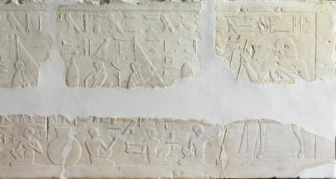 | Keywords: Egyptian - Lintel with Musicians and Game Players - Walters 22152-22153 - Detail B.jpg This block probably once served as the lintel of a doorway in the tomb of Ankh-ef-en-sekhmet He is represented on the right side of the lintel Carved in very low relief this piece depicts musicians and game-players before the deceased Ankh-ef-en-Sakhmet The entire relief has a plain border running around its perimeter At the right is the deceased seated and facing left He sits upon a high-backed and armed chair with cow's legs which sits upon some type of mat He holds a staff in his right hand while his left hand rests on the arm of the chair In front of him is the upper part of a figure who places a lotus blossom in front of his face Behind him are three groups of performers the first one a harpist and a flute-player the second one a harpist and a double clarinet-player and the third one consisting of three singers; they are separated from each other by large vessels In the lower row is depicted a person who turns to grab the staff of Ankh-ef-en-Sakhmet followed by three pairs of game-players The group farthest to the right consists of two pairs of people playing the game mehen while the group behind them consists of two men playing senet There is a row of inscriptions at the top of the piece along with captions referring to each of the performers in the upper row and the words spoken by each of the members of the groups of game players in the lower row There are also intrusive inscriptions between Ankh-ef-en-Sakhmet's staff and the head of the lotus blossom-holder and in front of each of the two individuals playing senet in the lower left corner of the piece They were added in the 27th Dynasty in the time of Darius I and Artaxerxes I There is still a large piece missing between Walters 22 152 and 22 153 and a smaller piece missing between those two and the piece formerly in Seattle upper right There is a faint trace of red on the large figure's shoulder not quite large enough to establish that the whole was painted though it is quite possible that it was 550-525 BC; Secondary inscriptions 500-450 BC Late Period limestone with remains of red and black paint cm 48 144 ; framed cm 52 150 9 accession number 22 152-22 153 34307 22 152 Khawam brothers Dikran Kelekian New York and Paris Henry Walters city Baltimore Walters Art Museum 1931 by bequest 22 152C Seattle Art Museum date and mode of acquisition unknown Walters Art Museum 1957 by purchase 22 153 Khawam brothers Dikran Kelekian New York and Paris Henry Walters city Baltimore Walters Art Museum Henry Walters Acquired by Henry Walters 1930 and 1931 and Museum purchase 1957 In Search of Ancient Treasure 40 Years of Collecting The Walters Art Gallery Baltimore 1978 place of origin Memphis Egypt Walters Art Museum license Ancient Egyptian reliefs in the Walters Art Museum Ancient Egyptian art from Memphis Games of Ancient Egypt Musical instruments in ancient Egypt Harps in ancient Egypt Mehen game in Ancient Egypt Ankh-ef-en-sekhmet |