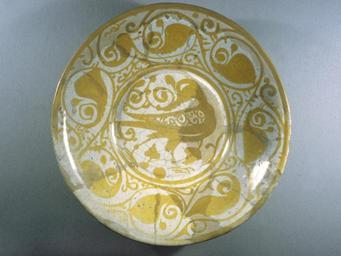 | Keywords: Egyptian - Lusterware Plate with Bird Motif - Walters 482036.jpg Decorative lusterware was popular during the Fatimid Period 910-1171 The most important production place was in the cultural center of al-Fustad near the Fatimid capital al-Qahira Cairo This plate displays a typical motif of this time period a bird in a central roundel with leaves and branches and a broad frame with leaf arabesques Especially attractive are the variation of forms of the leaves and spiral-tendrils which modify the rhytmic pattern and the yellow-golden color of the painting century 11 Medieval earthenware with luster decoration and glaze cm 5 7 2 5 accession number 48 2036 20558 Estate of D G Kelekian Walters Art Museum 1951 by purchase Museum purchase 1951 place of origin Cairo Egypt Walters Art Museum license Islamic art in the Walters Art Museum Fatimid pottery Lustreware 11th-century pottery |