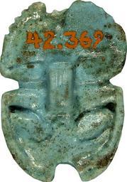 | Keywords: Egyptian - Naturalistic Scarab - Walters 42369 - Bottom.jpg Naturalistic scarabs which exhibit a beetle-formed underside instead of a flat bottom with additional motifs became popular in the late Third Intermediate and Late periods They were attached to the mummy bandages and were part of the amulet set There are two varieties of such scarabs red carnelian and blue-green faience scarabs It is likely that the blue-green scarabs focus only on the renewal aspect while the red carnelian scarabs were related to the sun rise/set aspect and gave special protection at the critical transition phase between 664 525 BC Late Period Egyptian faience with blue-green glaze cm 1 4 2 3 3 3 accession number 42 369 8310 Henry Walters Baltimore 1929 mode of acquisition unknown Walters Art Museum Henry Walters Acquired by Henry Walters 1929 place of origin Egypt Walters Art Museum license Ancient Egyptian scarabs in the Walters Art Museum Media contributed by the Walters Art Museum needs category review |