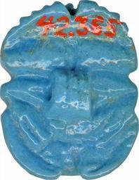 | Keywords: Egyptian - Naturalistic Scarab - Walters 42365 - Bottom.jpg The ancient Egyptians believed that the dung beetle the Scarabaeus sacer was one of the manifestations of the sun god Representations of these beetles were used as amulets and for ritual or administrative purposes Naturalistic scarabs such as this were used as part of the amulet set of the mummy They have a naturalistically formed belly and no additional inscriptions or motifs The back of this example is very high and the highest point is the pronotum dorsal plate of the prothorax Pronotum and elytron wing cases are separated by a curved incised partition line and the wing cases by a vertical hatch line pattern The quarter-spherical head is flanked by quarter-spherical eyes that protrude from the head; the trapezoidal side plates are decorated with hatch lines and clypeus has four frontal serrations The proportions of the top are slightly unbalanced the head is small in comparison to plates and clypeus and the pronotum is large in comparison to the elytron The modeled extremities have natural form and hatch notches on the frontlegs for the tibial teeth Two notches are at both side edges and one at the front and rear edge The bottom is naturally formed and an eye protrudes from the center of the belly The bottom structure is standardized and the extremities visible; the round eye with horizontal drill-hole is big and protrudes completely from the body of the beetle The basic form of the scarab is round-oval The scarab is funerary amulet with regenerative function which was attached to mummy bandages between 664 525 BC Late Period light beige faience with blue glaze cm 1 2 1 7 2 2 accession number 42 365 17658 Henry Walters Baltimore date and mode of acquisition unknown Walters Art Museum Henry Walters Acquired by Henry Walters Faience The Colors of the Heavens The Walters Art Museum Baltimore; The Walters Art Museum Baltimore 2003-2004 place of origin Egypt Walters Art Museum license Ancient Egyptian scarabs in the Walters Art Museum Media contributed by the Walters Art Museum needs category review |