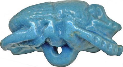 | Keywords: Egyptian - Naturalistic Scarab - Walters 42365 - Right.jpg The ancient Egyptians believed that the dung beetle the Scarabaeus sacer was one of the manifestations of the sun god Representations of these beetles were used as amulets and for ritual or administrative purposes Naturalistic scarabs such as this were used as part of the amulet set of the mummy They have a naturalistically formed belly and no additional inscriptions or motifs The back of this example is very high and the highest point is the pronotum dorsal plate of the prothorax Pronotum and elytron wing cases are separated by a curved incised partition line and the wing cases by a vertical hatch line pattern The quarter-spherical head is flanked by quarter-spherical eyes that protrude from the head; the trapezoidal side plates are decorated with hatch lines and clypeus has four frontal serrations The proportions of the top are slightly unbalanced the head is small in comparison to plates and clypeus and the pronotum is large in comparison to the elytron The modeled extremities have natural form and hatch notches on the frontlegs for the tibial teeth Two notches are at both side edges and one at the front and rear edge The bottom is naturally formed and an eye protrudes from the center of the belly The bottom structure is standardized and the extremities visible; the round eye with horizontal drill-hole is big and protrudes completely from the body of the beetle The basic form of the scarab is round-oval The scarab is funerary amulet with regenerative function which was attached to mummy bandages between 664 525 BC Late Period light beige faience with blue glaze cm 1 2 1 7 2 2 accession number 42 365 17658 Henry Walters Baltimore date and mode of acquisition unknown Walters Art Museum Henry Walters Acquired by Henry Walters Faience The Colors of the Heavens The Walters Art Museum Baltimore; The Walters Art Museum Baltimore 2003-2004 place of origin Egypt Walters Art Museum license Ancient Egyptian scarabs in the Walters Art Museum Media contributed by the Walters Art Museum needs category review |