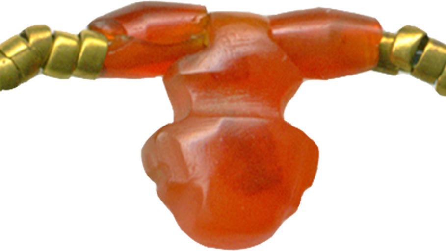 | Keywords: Egyptian - Necklace - Walters 571515 - Detail B.jpg This restrung necklace consists of biconical carnelian beads beads of rolled strips of sheet gold and ten amulets The rooster and couchant animal at either end of the necklace cast of a pale yellow metal probably do not belong Below the rooster at left is a tiny heart amulet of carnelian The other amulets are cut out of sheet gold of varying thickness and have rolled sheet gold loops attached to the back Below the couchant animal at right is an amulet showing a man holding palm branches which symbolized millions of years The six remaining figures are hieroglyphs as well The three birds at left probably represent the sacred ibis of the god Thoth although the long body of one and thick bill of another seem more appropriate to ducks Two amulets show the double crown resting on a basket which signified royal power in Upper and Lower Egypt Another basket amulet has something protruding from it between 2000 1600 BC Middle Kingdom gold and carnelian beads Bird cm 0 67 0 38 ; Ib H 1/16 0 2 x 0 05 cm ; Ibis I cm 0 55 0 79 ; Ibis II cm 0 35 0 3 ; Vulture cm 0 48 0 31 ; Double Crown I cm 0 29 0 22 ; Double Crown II cm 0 56 0 43 ; Neb W 1/8 in 0 05 x 0 39 cm ; Heh cm 0 3 0 51 ; Animal W 1/16 in 0 04 x 0 23 cm accession number 57 1515 24820 Henry Walters Baltimore date and mode of acquisition unknown Walters Art Museum Henry Walters Acquired by Henry Walters Jewelry - Ancient to Modern The Walters Art Gallery Baltimore 1979-1980 place of origin Egypt Walters Art Museum license Ancient Egyptian jewellery in the Walters Art Museum Media contributed by the Walters Art Museum needs category review |