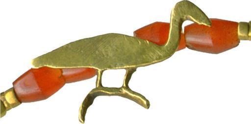 | Keywords: Egyptian - Necklace - Walters 571515 - Detail C.jpg This restrung necklace consists of biconical carnelian beads beads of rolled strips of sheet gold and ten amulets The rooster and couchant animal at either end of the necklace cast of a pale yellow metal probably do not belong Below the rooster at left is a tiny heart amulet of carnelian The other amulets are cut out of sheet gold of varying thickness and have rolled sheet gold loops attached to the back Below the couchant animal at right is an amulet showing a man holding palm branches which symbolized millions of years The six remaining figures are hieroglyphs as well The three birds at left probably represent the sacred ibis of the god Thoth although the long body of one and thick bill of another seem more appropriate to ducks Two amulets show the double crown resting on a basket which signified royal power in Upper and Lower Egypt Another basket amulet has something protruding from it between 2000 1600 BC Middle Kingdom gold and carnelian beads Bird cm 0 67 0 38 ; Ib H 1/16 0 2 x 0 05 cm ; Ibis I cm 0 55 0 79 ; Ibis II cm 0 35 0 3 ; Vulture cm 0 48 0 31 ; Double Crown I cm 0 29 0 22 ; Double Crown II cm 0 56 0 43 ; Neb W 1/8 in 0 05 x 0 39 cm ; Heh cm 0 3 0 51 ; Animal W 1/16 in 0 04 x 0 23 cm accession number 57 1515 24820 Henry Walters Baltimore date and mode of acquisition unknown Walters Art Museum Henry Walters Acquired by Henry Walters Jewelry - Ancient to Modern The Walters Art Gallery Baltimore 1979-1980 place of origin Egypt Walters Art Museum license Ancient Egyptian jewellery in the Walters Art Museum Media contributed by the Walters Art Museum needs category review |