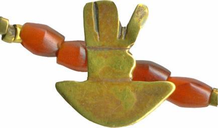 | Keywords: Egyptian - Necklace - Walters 571515 - Detail G.jpg This restrung necklace consists of biconical carnelian beads beads of rolled strips of sheet gold and ten amulets The rooster and couchant animal at either end of the necklace cast of a pale yellow metal probably do not belong Below the rooster at left is a tiny heart amulet of carnelian The other amulets are cut out of sheet gold of varying thickness and have rolled sheet gold loops attached to the back Below the couchant animal at right is an amulet showing a man holding palm branches which symbolized millions of years The six remaining figures are hieroglyphs as well The three birds at left probably represent the sacred ibis of the god Thoth although the long body of one and thick bill of another seem more appropriate to ducks Two amulets show the double crown resting on a basket which signified royal power in Upper and Lower Egypt Another basket amulet has something protruding from it between 2000 1600 BC Middle Kingdom gold and carnelian beads Bird cm 0 67 0 38 ; Ib H 1/16 0 2 x 0 05 cm ; Ibis I cm 0 55 0 79 ; Ibis II cm 0 35 0 3 ; Vulture cm 0 48 0 31 ; Double Crown I cm 0 29 0 22 ; Double Crown II cm 0 56 0 43 ; Neb W 1/8 in 0 05 x 0 39 cm ; Heh cm 0 3 0 51 ; Animal W 1/16 in 0 04 x 0 23 cm accession number 57 1515 24820 Henry Walters Baltimore date and mode of acquisition unknown Walters Art Museum Henry Walters Acquired by Henry Walters Jewelry - Ancient to Modern The Walters Art Gallery Baltimore 1979-1980 place of origin Egypt Walters Art Museum license Ancient Egyptian jewellery in the Walters Art Museum Media contributed by the Walters Art Museum needs category review |