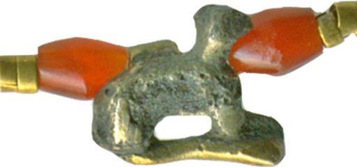 | Keywords: Egyptian - Necklace - Walters 571515 - Detail J.jpg This restrung necklace consists of biconical carnelian beads beads of rolled strips of sheet gold and ten amulets The rooster and couchant animal at either end of the necklace cast of a pale yellow metal probably do not belong Below the rooster at left is a tiny heart amulet of carnelian The other amulets are cut out of sheet gold of varying thickness and have rolled sheet gold loops attached to the back Below the couchant animal at right is an amulet showing a man holding palm branches which symbolized millions of years The six remaining figures are hieroglyphs as well The three birds at left probably represent the sacred ibis of the god Thoth although the long body of one and thick bill of another seem more appropriate to ducks Two amulets show the double crown resting on a basket which signified royal power in Upper and Lower Egypt Another basket amulet has something protruding from it between 2000 1600 BC Middle Kingdom gold and carnelian beads Bird cm 0 67 0 38 ; Ib H 1/16 0 2 x 0 05 cm ; Ibis I cm 0 55 0 79 ; Ibis II cm 0 35 0 3 ; Vulture cm 0 48 0 31 ; Double Crown I cm 0 29 0 22 ; Double Crown II cm 0 56 0 43 ; Neb W 1/8 in 0 05 x 0 39 cm ; Heh cm 0 3 0 51 ; Animal W 1/16 in 0 04 x 0 23 cm accession number 57 1515 24820 Henry Walters Baltimore date and mode of acquisition unknown Walters Art Museum Henry Walters Acquired by Henry Walters Jewelry - Ancient to Modern The Walters Art Gallery Baltimore 1979-1980 place of origin Egypt Walters Art Museum license Ancient Egyptian jewellery in the Walters Art Museum Media contributed by the Walters Art Museum needs category review |