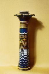 | Keywords: Egyptian - Palm Column Kohl Tube - Walters 4741.jpg The Egyptian learned from their Near Eastern neighbors how to make glass At first they imported the raw material and processed it in Egypt but soon they learned how to produce it by themselves This core-formed glass kohl tube is datable to the 18th Dynasty Originally there would have been a long thin glass applicator for the kohl as well The palm column shape was quite common for glass kohl tubes The body of the vessel is composed of translucent bright turquoise colored glass and the surface polish is in excellent condition The flaring palm top is outlined in dark yellow glass and the opening of the vessel is outlined in opaque white glass The neck of the tube is decorated with six raised threads of glass The body is decorated with threads of yellow and white glass which have been dragged to form a festoon pattern The bottom of the tube is rounded and has a flared ridge around the edge Some of the core material is still visible inside ca 1450 1300 BC New Kingdom glass cm 11 3 9 h x diam accession number 47 41 7022 Henry Walters Baltimore 1914 mode of acquisition unknown Walters Art Museum Henry Walters Acquired by Henry Walters 1914 place of origin Malkata present-day Western Thebes Egypt Walters Art Museum license Ancient Egyptian art in the Walters Art Museum Ancient Egyptian kohl artifacts Palmiform columns Ancient Egyptian glassware Ancient Egyptian art from Malkata Kohl Vase |