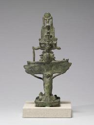 | Keywords: Egyptian - Pantheistic Bes - Walters 54540 - Back.jpg This depicts a composite deity who has the attributes and therefore the powers of several different gods The face of the god Bes the twin plumes and ram horns of Amun's crown the head of an ibis crowned by the crescent and full moon of Thoth and several snakes and crocodiles can be seen The wings and falcon tail are related to the sky god Horus and the jackal Anubis There are many more aspects which refer to a multitude of divine aspects By incorporating these elements into a single figure the statuette protected the owner from many evils ca 250 100 BC Greco-Roman bronze cm 24 6 13 11 9 73 accession number 54 540 10883 Henry Walters city Baltimore Walters Art Museum Henry Walters Acquired by Henry Walters 1931 place of origin Egypt Walters Art Museum license Ancient Egyptian statues in the Walters Art Museum Statuettes of Bes Media contributed by the Walters Art Museum needs category review |
