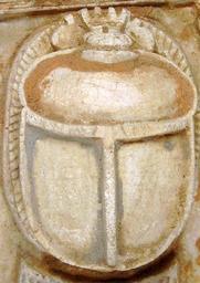 | Keywords: Egyptian - Pectoral with Scarab - Walters 4291 - Front View A.jpg The ancient Egyptians believed that the dung beetle the Scarabaeus sacer was one of the manifestations of the sun god Representations of these beetles were used as amulets and for ritual or administrative purposes The rectangular shrine shaped pectoral has a large scarab in the center The front displays an adoration scene scarab and baboons in a sun barque The shrine has a cavetto cornice at the top with an incised winged sun disk painted red and a base with lotus flower frieze in red and blue The central scene is additionally framed on the top and side by a color key whose colors are mostly gone The motif displays a scarab in a barque flanked by two baboons in adoration gesture; the mantle of the baboons shows a crossed hatched pattern All three figures have an extra base the one of the scarab decorated with a reed pattern Below the barque is a section with a herringbone pattern representing water In the right and left corner are short text columns with the name Wsjr Osiris The space around the figures was filled with red below the barque with blue color paste The motif is antithetically arranged that the baboons are facing the scarab The scarab's head plates and clypeus front plate are carved; pronotum dorsal plate of the prothorax elytron wing cases and the division between the wing cases are marked by raised borders to confine the color filling pronotum red wing cases blue The extremities are carved and have hatch notches on the upper sides for the tibial teeth and the pilosity hair The reverse of the shrine shaped pectoral displays an adoration scene with Osiris and private worshipper The flat shrine is framed by a cavetto cornice and color key borders with four-line dividers The central scene displays the god Osiris on the left crowned with double-feathers ram horns and cobra serpents He holds crock and flail in his hands and is seated on a block throne with a cushion overlapping the back His name is written in front of his crown The figure on the right side represents the female owner of the pectoral; she wears a long pleated dress a long wig that does not cover the ears and has a lotus flower on her head; she raises her arms in an adoration gesture Above her hands is an inscription containing the name of Osiris Between both figures is an empty oval frame which represents the juvenile sun resting on an dd-pillar with two arms embracing the sun The dominating icon of the scene is the big oval in the center and the two figures to the right and left look slightly built in comparison to it The figure of Osiris fills the whole height of the space including his base and crown indicating an equal importance to the scarab The front and back are executed in raised and sunk relief; the front has also colored past filling The scarab on the front is dominant by its size central position and raised round sculpted forms; the two flanking baboons are also prominent by their size and the very high raised relief; all the other details of shrine shaped pectoral are executed in high relief except the incised wings of the sun disc in the cavetto cornice; the layout is well organized but the scarab and its base in the barque are lopsided; noteworthy are the rectangular raised sections in the upper corners of the image field with the name of Osiris Only the blue and red color has been preserved and it is important to realize that only the scarab has a three-color spectrum red blue and white or yellow/gold The reverse side is more flatly executed the figures are carved in high relief; there are as on the other side two raised rectangular text fields for the incised inscriptions The figures are slender and slightly rough; the garments are detailed with very fine hatch line or dot pattern; the layout is balanced but the figure of Osiris seems slim in comparison to the worshiping lady due to his large crown and high throne base; moreover the central oval frame which originally held a scarab is lopsided The scarab-pectoral is a funerary amulet which was originally attached to mummy wrappings The amulet should assure the renewal of the deceased in the afterlife similar to that of the god Osiris which is why the inscription which names the seated god is the same as the inscription which identifies the worshipping deceased The combination of sun-oval and dd-pillar of Osiris represents the unification of both deities and of the cyclical and the linear aspects of time and eternity; the result is the renewal of both deities of this and the other world as well as the deceased While the reverse of the pectoral focuses on the unification process the front represents the renewal scarab with baboons in the barque and rising of the sun winged sun disc The amulet should guarantee the meeting of the deceased with the sun god and his consequential renewal It is striking that on both sides the scarab is lopsided; it seems to be unlikely that this was just a mistake of a less qualified artist Most probably the lopsided placement has to do with the idea of the sloping celestial path which can be expressed by a lopsided sky hieroglyph The motif of the scarab in the barque flanked by solar baboons is rare on private pectorals of the New Kingdom and more popular on scarabs Walters 42 396 or finger rings see between 1292 1070 BC New Kingdom steatite with color inlays cm 12 5 10 2 9 5 accession number 42 91 14857 Dikran Kelekian New York and Paris date and mode of acquisition unknown Henry Walters city Baltimore Walters Art Museum Henry Walters Acquired by Henry Walters 1929 Translation Osiris Jewelry - Ancient to Modern The Walters Art Gallery Baltimore 1979-1980 Objects of Adornment Five Thousand Years of Jewelry from the Walters Art Gallery Baltimore Cooper-Hewitt National Design Museum New York; Chrysler Museum of Art Norfolk; Carnegie Museum of Art Pittsburgh; San Antonio Museum of Art San Antonio; Philbrook Museum of Art Tulsa; Honolulu Academy of