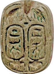 | Keywords: Egyptian - Plaque with the Throne Name of Thutmosis IV - Walters 4228 - Reverse.jpg This symmetrical oval plaque has icons and inscriptions on both sides The front depicts an icon and image of King Thutmosis IV 1397-1388 BC ; on the back is a representation of a vulture combined with the royal name Both sides are executed in sunk relief with deeply incised outlines and finer lines on the inner structures The sides are smoothed and the layout is balanced The piece is carefully made The plaque functioned as an individualized amulet and was originally mounted and threaded The amulet should secure the divinity and royal authority for the king as well as divine protection; it should provide a private owner with his royal patronage and divine protection The figure of the vulture above a cartouche is less common on scarabs; more often are examples displaying the vulture with outstretched wings at the side of the royal name Oval plaques of this type are typical for the 18th Dynasty especially for the period of the reign of Thutmosis III 1479-1425 BC -Amenophis III 1388-1351/1350 BC between 1397 1388 BC New Kingdom light beige faience with blue-green glaze cm 0 5 1 3 1 9 accession number 42 28 6714 Henry Walters Baltimore date and mode of acquisition unknown Walters Art Museum Henry Walters Acquired by Henry Walters Translation On front throne name of King Thutmose IV in a cartouche combined with the royal divinity title and state ruler title The Great God Lord of the Two Lands / Men-kheperu-Re ; Translation On reverse Men-kheperu-Re Men-kheperu-Re place of origin Egypt <gallery> File Egyptian - Plaque with the Throne Name of Thutmosis IV - Walters 4228 - Reverse Impression jpg File Egyptian - Plaque with the Throne Name of Thutmosis IV - Walters 4228 - Reverse Impression Detail jpg </gallery> Walters Art Museum license Ancient Egyptian plaques in the Walters Art Museum Cartouches of Thutmosis IV Media contributed by the Walters Art Museum needs category review |