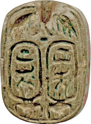 Keywords: Egyptian - Plaque with the Throne Name of Thutmosis IV - Walters 4228 - Reverse.jpg This symmetrical oval plaque has icons and inscriptions on both sides The front depicts an icon and image of King Thutmosis IV 1397-1388 BC ; on the back is a representation of a vulture combined with the royal name Both sides are executed in sunk relief with deeply incised outlines and finer lines on the inner structures The sides are smoothed and the layout is balanced The piece is carefully made The plaque functioned as an individualized amulet and was originally mounted and threaded The amulet should secure the divinity and royal authority for the king as well as divine protection; it should provide a private owner with his royal patronage and divine protection The figure of the vulture above a cartouche is less common on scarabs; more often are examples displaying the vulture with outstretched wings at the side of the royal name Oval plaques of this type are typical for the 18th Dynasty especially for the period of the reign of Thutmosis III 1479-1425 BC -Amenophis III 1388-1351/1350 BC between 1397 1388 BC New Kingdom light beige faience with blue-green glaze cm 0 5 1 3 1 9 accession number 42 28 6714 Henry Walters Baltimore date and mode of acquisition unknown Walters Art Museum Henry Walters Acquired by Henry Walters Translation On front throne name of King Thutmose IV in a cartouche combined with the royal divinity title and state ruler title The Great God Lord of the Two Lands / Men-kheperu-Re ; Translation On reverse Men-kheperu-Re Men-kheperu-Re place of origin Egypt <gallery> File Egyptian - Plaque with the Throne Name of Thutmosis IV - Walters 4228 - Reverse Impression jpg File Egyptian - Plaque with the Throne Name of Thutmosis IV - Walters 4228 - Reverse Impression Detail jpg </gallery> Walters Art Museum license Ancient Egyptian plaques in the Walters Art Museum Cartouches of Thutmosis IV Media contributed by the Walters Art Museum needs category review |