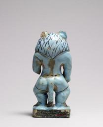 | Keywords: Egyptian - Protective Figure of Aha-Bes - Walters 48420 - Back.jpg Resembling the protective deity Bes this benevolent demon holds a snake in each hand symbolizing his ability to ward off the bites and stings of venomous creatures The figure has the proportions of a dwarf the head mane and tail of a lion and human eyes Similar figures to this one were depicted on magical wands of the Middle Kingdom The details of the figure such as the eyes mane nipples and the snakes are marked with dark blue lines and dots ca 1800 1750 BC Second Intermediate faience with blue glaze cm 17 2 7 6 4 9 accession number 48 420 37996 William MacGregor Tamworth Staffordshire Sale Sotheby Wilkinson Hodge London June 26-29 and July 4-6 1922 Henry Walters city Baltimore Walters Art Museum Henry Walters Acquired by Henry Walters 1922 place of origin Dra abu'l Naga present-day Western Thebes Egypt Walters Art Museum license Ancient Egyptian statuettes in the Walters Art Museum Ancient Egyptian faience in the Walters Art Museum Bes amulet Media contributed by the Walters Art Museum needs category review |