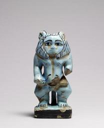| Keywords: Egyptian - Protective Figure of Aha-Bes - Walters 48420.jpg Resembling the protective deity Bes this benevolent demon holds a snake in each hand symbolizing his ability to ward off the bites and stings of venomous creatures The figure has the proportions of a dwarf the head mane and tail of a lion and human eyes Similar figures to this one were depicted on magical wands of the Middle Kingdom The details of the figure such as the eyes mane nipples and the snakes are marked with dark blue lines and dots ca 1800 1750 BC Second Intermediate faience with blue glaze cm 17 2 7 6 4 9 accession number 48 420 37996 William MacGregor Tamworth Staffordshire Sale Sotheby Wilkinson Hodge London June 26-29 and July 4-6 1922 Henry Walters city Baltimore Walters Art Museum Henry Walters Acquired by Henry Walters 1922 place of origin Dra abu'l Naga present-day Western Thebes Egypt Walters Art Museum license Ancient Egyptian statuettes in the Walters Art Museum Ancient Egyptian faience in the Walters Art Museum Bes amulet Media contributed by the Walters Art Museum needs category review |