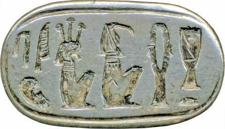 | Keywords: Egyptian - Ring Bezel - Walters 571487 - View D.jpg This flat silver bezel with under surface carved to fit the finger belonged to a type of ring of the 26th Dynasty in which the bezel perched above the separately cast hoop The deeply set hieroglyphs which decorate the bezel appear to have been gouged into the surface with some chased detail The piece shows signs of much wear When bought it had a plug of some iron compound under the bezel This probably represents the efforts of a village tinker of the 19th century to reattach the hoop Two unfinished rings of the type in the old Abbott collection now in the Brooklyn Museum had been repaired in this fashion Under the plug on the Walters ring was a lightly scratched sign The hieroglyphs on the bezel read servant of Bastet Djehuty-sotem-nis Thoth hears the caller century 7 6 BC early Late Period silver Bezel cm 2 1 15 0 3 ; Inner Diam cm 3 2 ; Outer Diam cm 3 7 accession number 57 1487 34444 Dikran Kelekian New York and Paris date and mode of acquisition unknown Henry Walters Baltimore date of acquisition unknown by purchase Walters Art Museum Henry Walters Acquired by Henry Walters Translation Priest of Bastet Djehuti-sedjem-nis Thoth hears the caller Jewelry - Ancient to Modern The Walters Art Gallery Baltimore 1979-1980 place of origin Egypt Walters Art Museum license Ancient Egyptian finger rings in the Walters Art Museum Works of the 26th dynasty of Egypt Hieroglyphs on metal Papyrus mat sa hieroglyph Thoth-god hieroglyph Hapy Ear hieroglyph Tinkers |
