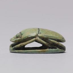 | Keywords: Egyptian - Scarab Amulet - Walters 4258 - Left Profile.jpg The ancient Egyptians believed that the dung beetle the Scarabaeus sacer was one of the manifestations of the sun god Representations of these beetles were used as amulets and for ritual or administrative purposes This scarab displays on the bottom side the figure of the goddess Taweret Her appearance combines a hippopotamus body lion paws crocodile head and tail and human arms and hands The goddess is standing on her hindlegs and her left arm is out stretched in front of her Above the goddess is a human eye It is possible to interpret both icons as hieroglyphs and translate Taweret is watchful The bottom design is linearly incised and hollowed out in sunk relief the depicted eye is done with very fine lines and dominant to the figure of the goddess by its size and placement; the figure of Taweret is for a hippopotamus unusually slender and elongated; the left outstretched arm with the open human hand is very slim and long and fills the empty space in front of the goddess; it is disproportional to her right arm which is placed beside her body; the whole layout is well organized but there is more space between the eye and the upper part of the frame than between Taweret and the lower part The highest point of the back is the partition between pronotum dorsal plate of the prothorax and elytron wing cases Pronotum and elytron have incised borderlines separation lines and V-shaped marks for humeral callosities shoulder thickenings The long-oval head is flanked by quarter-spherical eyes; the irregularly trapezoidal side plates show outside-depressions and the clypeus front plate four serrations The raise extremities have natural form and vertical hatch lines for the tibial teeth and pilosity hair The base is symmetrically oval The bottom design is linearly incised and hollowed out in sunk relief the depicted eye is done with very fine lines and dominant to the figure of the goddess by its size and placement; the figure of Taweret is for a hippopotamus unusually slender and elongated; the left outstretched arm with the open human hand is very slim and long and fills the empty space in front of the goddess; it is disproportional to her right arm which is placed beside her body; the whole layout is well organized but there is more space between the eye and the upper part of the frame than between Taweret and the lower part The scarab is longitudinally pierced was originally mounted or threaded and functioned as an amulet It should secure the protection of the goddess and refer to her watchfulness It might have been created to protect pregnant women or newborn children The figure of Taweret is an unusual variant with a crocodile instead of a hippopotamus head It is also unusual that the goddess has no nb-basket or other element below her feet to function as a baseline between 1070 736 BC Third Intermediate light beige steatite with blue-green glaze cm 1 5 1 1 0 7 accession number 42 58 17657 Henry Walters Baltimore 1929 mode of acquisition unknown Walters Art Museum Henry Walters Acquired by Henry Walters 1929 Translation Taweret is watchful place of origin Egypt Walters Art Museum license Ancient Egyptian scarabs in the Walters Art Museum Scarab amulet Media contributed by the Walters Art Museum needs category review |