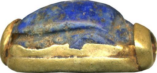 | Keywords: Egyptian - Scarab Ring Bezel - Walters 42388 - Right.jpg Sheet gold neatly molded across the back and around the edges of a lapis lazuli scarab forms the surface into which finely detailed hieroglyphs are chased A ring of sheet gold was added around the perforations at either end The inscription reads Chiefs of The Priestly Guild of Horus which suggests that the ring was a mark of professional status between 1186 1070 BC late New Kingdom lapis lazuli gold setting cm 0 7 1 1 5 accession number 42 388 34999 Maurice Nahman Cairo date and mode of acquisition unknown Henry Walters city Baltimore Walters Art Museum Henry Walters Acquired by Henry Walters 1930 Translation Leaders of the priestly group phyle of Horus Jewelry - Ancient to Modern The Walters Art Gallery Baltimore 1979-1980 place of origin Egypt Walters Art Museum license Ancient Egyptian scarabs in the Walters Art Museum Ancient Egyptian finger rings in the Walters Art Museum |