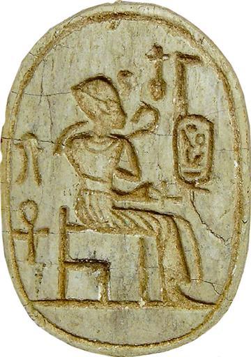 Keywords: Egyptian - Scarab - Walters 42376 - Bottom.jpg The ancient Egyptians believed that the dung beetle the Scarabaeus sacer was one of the manifestations of the sun god Representations of these beetles were used as amulets and for ritual or administrative purposes This scarab has a bottom design that displays King Amenhotep III seated on his throne He is dressed in a long pleated shendyt wears the so-called Blue crown with Uraeus-serpent and crown sash The king holds with his left hand the crook in front of his chest and with his right an ankh-sign meaning life The block throne has a small back In front of him is a column with a left reading inscription containing his throne name and title and behind him the hieroglyphs for protection and life The layout is well organized but it is notable that the royal figure does not fill the whole space and that the Uraeus on the forehead of the king is unusually large The highest point of the scarab's back is the pronotum dorsal plate of the prothorax Pronotum and elytron wing cases have deeply incised fine borderlines single separation lines V-shaped marks for the humeral callosities shoulder thickenings and small side-depressions The partition lines between pronotum and elytron meet V-shaped The rectangular head is flanked by triangular eyes The trapezoidal side plates have curved outer edges and borderlines and the clypeus front plate has four frontal serrations and two central base notches The raised slender extremities have natural form; the background between the legs is deeply hollowed out The low oval base is symmetrical The scarab is longitudinally pierced was originally mounted or threaded and functioned as an amulet It secures the existence life protection divinity title Perfect god and royal authority cartouche seated king with scepter for the king and provides a private owner with his patronage and protection between 1388 1351 BC New Kingdom steatite with green glaze and residue of white underglaze cm 1 9 3 3 4 7 accession number 42 376 3211 Henry Walters Baltimore 1930 mode of acquisition unknown Walters Art Museum Henry Walters Acquired by Henry Walters 1930 Translation Throne name of King Amenhotep III with cartouche and combined with divinity title The Perfect God Neb-Maat-Re / Protection and life place of origin Egypt Walters Art Museum license Ancient Egyptian scarabs in the Walters Art Museum Scarabs of Amenhotep III Papyrus mat sa hieroglyph Ankh hieroglyph |