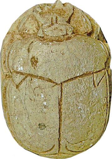 Keywords: Egyptian - Scarab - Walters 42376 - Back.jpg The ancient Egyptians believed that the dung beetle the Scarabaeus sacer was one of the manifestations of the sun god Representations of these beetles were used as amulets and for ritual or administrative purposes This scarab has a bottom design that displays King Amenhotep seated on his throne He is dressed in a long pleated shendyt wears the so-called Blue crown with Uraeus-serpent and crown sash The king holds with his left hand the crook in front of his chest and with his right an ankh-sign meaning life The block throne has a small back In front of him is a column with a left reading inscription containing his throne name and title and behind him the hieroglyphs for protection and life The layout is well organized but it is notable that the royal figure does not fill the whole space and that the Uraeus on the forehead of the king is unusually large The highest point of the scarab's back is the pronotum dorsal plate of the prothorax Pronotum and elytron wing cases have deeply incised fine borderlines single separation lines V-shaped marks for the humeral callosities shoulder thickenings and small side-depressions The partition lines between pronotum and elytron meet V-shaped The rectangular head is flanked by triangular eyes The trapezoidal side plates have curved outer edges and borderlines and the clypeus front plate has four frontal serrations and two central base notches The raised slender extremities have natural form; the background between the legs is deeply hollowed out The low oval base is symmetrical The scarab is longitudinally pierced was originally mounted or threaded and functioned as an amulet It secures the existence life protection divinity title Perfect god and royal authority cartouche seated king with scepter for the king and provides a private owner with his patronage and protection between 1388 1351 BC New Kingdom steatite with green glaze and residue of white underglaze cm 1 9 3 3 4 7 accession number 42 376 3211 Henry Walters Baltimore 1930 mode of acquisition unknown Walters Art Museum Henry Walters Acquired by Henry Walters 1930 Translation Throne name of King Amenhotep III with cartouche and combined with divinity title The Perfect God Neb-Maat-Re / Protection and life place of origin Egypt Walters Art Museum license Ancient Egyptian scarabs in the Walters Art Museum Media contributed by the Walters Art Museum needs category review |