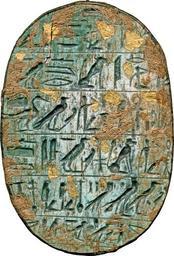 | Keywords: Egyptian - Scarab with Pseudo-text - Walters 421 - Bottom.jpg The ancient Egyptians believed that the dung beetle the Scarabaeus sacer was one of the manifestations of the sun god Representations of these beetles were used as amulets and for ritual or administrative purposes The back of this large scarab has its highest point at the elytron wing cases Partition and division lines of pronotum dorsal plate of the prothorax and elytron are covered with a setting of golden bands The rectangular head is flanked by semi-ovoid eyes; the side plates are trapezoidal with curved outer edges and the clypeus front plate is five times serrated The raised slender extremities have natural form and the background between the legs is hollowed out The shape of the low base is symmetrically long-oval The inscription on the bottom has seven lines of a left reading text and seven horizontal text dividers; the inscription is framed by an oval line The bottom inscription is executed in sunk relief or linearly incised; the hieroglyphs are slim and elongated some have inner structures and some are slightly disproportional; the layout has several irregularities such as lopsided signs or hoe-like pseudo-hieroglyphs which collide with the outer border The execution of back and bottom differs the back and sides are carefully formed but the bottom inscription is very rough The gold leaf and linen fragments are randomly attached The scarab is pierced lengthwise what normally refers to an additional mount or support but is unusual for a Heart scarab of this large size The scarab shows several discrepancies which lead to the conclusion that it was produced in modern times Most probably it imitates a Heart scarab which was made to be placed on the chest of a mummy To give it a more ancient look linen fragments were attached and to make it more precious small pieces of gold foil added The following discrepancies have to be mentioned - The text on the back is not a direct copy of an original Heart scarab and was created without adequate knowledge of ancient Egyptian language and script; - the script style has no ancient Egyptian parallel; - the name of an owner is missing and there is also not enough empty space to add a name as in unused prefabricated Heart scarabs; - the gold bands on the back seem to be copied from settings of hard stone scarabs but without understanding of the function of the bands as a setting; - a longitudinal drill would be unusual for a scarab of this size; - traces of the mummy wrappings would normally not adhere to the body of a glazed scarab and may have been adapted from wooden pieces late 19th-early 20th century light brown steatite with blue-green glaze gold leaf and linen cm 3 3 5 9 8 7 accession number 42 1 38790 Henry Walters city Baltimore Walters Art Museum Henry Walters Acquired by Henry Walters 1924 Inscription The inscription provides no clear context; the producer just copied words and signs Some signs have no real comparison in Egyptian script such as the baboon-headed animal with the tail of the god Seth or the short how-signs at the right and left edge of the lowest line and others are reversed or upside down There are also no obvious parallels to enigmatic texts or cryptographic writings place of origin Egypt Walters Art Museum license Ancient Egyptian scarabs in the Walters Art Museum Media contributed by the Walters Art Museum needs category review |