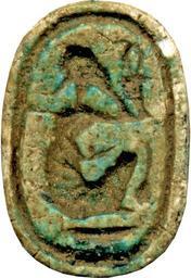 | Keywords: Egyptian - Scaraboid with Crouching Calf - Walters 4270 - Bottom (2).jpg The ancient Egyptians believed that the dung beetle the Scarabaeus sacer was one of the manifestations of the sun god Representations of these beetles were used as amulets and for ritual or administrative purposes Amulets with oval base and half-ovoid back representing other animals are named scaraboids This scaraboid displays the representation of a crouching calf The calf is facing to the right the head as well as the tail raised and bent back to the center of the back The figure fills the whole oval space; head tail and extremities are very close to the body giving a compact and balanced impression The unusual height of the scaraboid conveys the idea that the calf is crouching on top of a rock or pedestal The base has a symmetrically long-oval shape The bottom shows the figure of a squatting divine child which has the finger to the mouth an ankh-sign meaning life is in front of his face a lotus plant with bud hanging down above his knees and an nb-basket below his body The figure of the child is executed in sunk relief the high slim waist as well as the long neck and head make it likely that the piece was created in the Amarna or early Post-Amarna Period; the layout is well organized the figure of the child centered and only the nb-basket is a little small An oval line frames the arrangement The calf-scaraboid with divine child on the bottom has a renewal connotation The calf represents the daily reborn youth sun god of the celestial cow and the child represents probably not only the solar child but also the king Akhenaten between 1351 1334 BC New Kingdom; Amarna light beige faience with green-blue glaze cm 0 8 1 1 1 6 accession number 42 70 39367 Henry Walters Baltimore 1929 mode of acquisition unknown Walters Art Museum Henry Walters Acquired by Henry Walters 1929 place of origin Egypt <gallery> File Egyptian - Scaraboid with Crouching Calf - Walters 4270 - Bottom jpg </gallery> Walters Art Museum license Ancient Egyptian scarabs in the Walters Art Museum Media contributed by the Walters Art Museum needs category review |