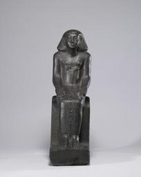| Keywords: Egyptian - Seated Figure of Nefer-hotep - Walters 22214.jpg This statue is of a non-royal seated man with hands held flat against his thighs The face is triangular with modeled brows The eyes are set into shallow narrow sockets The lids of the eyes are indicated by two modeled ridges Sculpture patrons of the Middle Kingdom favored the use of hard dark stones and compact block-like forms to insure the long-term survival of their statues The texts on the front of the shendyt and on the sides of the seat request offerings and record Neferhotep's name and titles as well as his parentage The deity invoked to secure the offerings is the deceased king who founded the Middle Kingdom Nebhepetre Mentuhotep II 11th Dynasty ca 1750 1700 BC Second Intermediate granodiorite cm 53 15 29 accession number 22 214 27934 Giovanni Dattari Cairo Dattari Collection Sale Hôtel Drouot Paris 1912 no 294 pl XXVIII Henry Walters city Baltimore Walters Art Museum 1931 by bequest Acquired by Henry Walters 1912 Inscription place of origin Egypt Walters Art Museum license Ancient Egyptian statues in the Walters Art Museum Statues of the Egyptian second intermediate period |