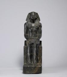 | Keywords: Egyptian - Sesostris III - Walters 22115.jpg Usually the sculptures of kings and queens have youthful confident contented and even slightly smiling facial expressions King Sesostris III broke dramatically with this tradition and his face shows signs of age concern and discontent He may have wished his sculptors to show him as the shepherd of his people heavily burdened by his care for their needs and the duties of monarchy Among the most important ancient Egyptian sculptures in the collection this statue is a classic representation of an Egyptian pharaoh He is shown wearing the nemes head cloth worn only by Egypt's monarchs with a uraeus protective serpent at the brow and a shendyt pleated skirt An unusual feature of this king's sculpture is the amulet suspended from a necklace ca 1850 BC Middle Kingdom black granite cm 60 96 18 57 36 51 approx accession number 22 115 18291 Dikran Kelekian New York and Paris Henry Walters city Baltimore Walters Art Museum 1931 by bequest Acquired by Henry Walters 1925 place of origin Upper Egypt Walters Art Museum license Ancient Egyptian statues in the Walters Art Museum Statues of Senusret III |