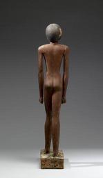 Keywords: Egyptian - Standing Male Figure - Walters 22211 - Back.jpg For a short period during the late Old Kingdom and the 1st Intermediate Period it was popular to show the tomb's owner without clothes These figures represent the deceased in the phase of renewal in front of the god Osiris lord of the underworld This tomb statue depicts a standing nude male with his left food advanced His body is inclined slightly backward perhaps to give the impression of striding Both of his arms are at his sides and both of his hands are closed This is possibly to indicate that he is holding something but we cannot discern exactly what it is as whatever it is does not extend out of his hands on either side His eyebrows are carved in relief and there are lines at the corners of his nose He wears a short haircut leaving his rather large ears uncovered He has a very deeply carved belly button and his toes are carved so as to be completely separated from each other; his fingers are not carved as deeply The rectangular base that he stands on is original and carries the inscription which reads the sole companion Ha'a The body is painted red the nipples black the hair black the eyes black and white and the base is painted black on the sides and red on its top The front of the left foot the left arm the right arm and the body were all made separately and were attached using dowels as can be seen in the case of the right leg The arms are joined at the shoulders The statue is anchored to the base by means of two wooden dowels which go through the base and through an invisible prong located under the right foot In addition to extensive paint loss in numerous places on the surface of this piece this statue has also suffered structural damage Cracks exist down the length of the base's top; a crack in the top of the back end of the base is filled in probably a modern repair In addition the top of the left foot the right shoulder joint and the back of the right hand are damaged between 2236 2150 BC late Old Kingdom-First Intermediate wood with red white and black paint cm 54 11 7 23 ; H with base cm 53 2 accession number 22 211 40432 Dikran Kelekian New York and Paris date and mode of acquistion unknown as 12th Dynasty Assiout Henry Walters city Baltimore Walters Art Museum Henry Walters Acquired by Henry Walters 1914 Translation On base the sole companion Ha'a Carved for Immortality The Walters Art Museum Baltimore 2004-2005 place of origin Meir Egypt Walters Art Museum license Ancient Egyptian statues in the Walters Art Museum Media contributed by the Walters Art Museum needs category review