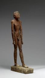 | Keywords: Egyptian - Standing Male Figure - Walters 22211 - Three Quarter Right.jpg For a short period during the late Old Kingdom and the 1st Intermediate Period it was popular to show the tomb's owner without clothes These figures represent the deceased in the phase of renewal in front of the god Osiris lord of the underworld This tomb statue depicts a standing nude male with his left food advanced His body is inclined slightly backward perhaps to give the impression of striding Both of his arms are at his sides and both of his hands are closed This is possibly to indicate that he is holding something but we cannot discern exactly what it is as whatever it is does not extend out of his hands on either side His eyebrows are carved in relief and there are lines at the corners of his nose He wears a short haircut leaving his rather large ears uncovered He has a very deeply carved belly button and his toes are carved so as to be completely separated from each other; his fingers are not carved as deeply The rectangular base that he stands on is original and carries the inscription which reads the sole companion Ha'a The body is painted red the nipples black the hair black the eyes black and white and the base is painted black on the sides and red on its top The front of the left foot the left arm the right arm and the body were all made separately and were attached using dowels as can be seen in the case of the right leg The arms are joined at the shoulders The statue is anchored to the base by means of two wooden dowels which go through the base and through an invisible prong located under the right foot In addition to extensive paint loss in numerous places on the surface of this piece this statue has also suffered structural damage Cracks exist down the length of the base's top; a crack in the top of the back end of the base is filled in probably a modern repair In addition the top of the left foot the right shoulder joint and the back of the right hand are damaged between 2236 2150 BC late Old Kingdom-First Intermediate wood with red white and black paint cm 54 11 7 23 ; H with base cm 53 2 accession number 22 211 40432 Dikran Kelekian New York and Paris date and mode of acquistion unknown as 12th Dynasty Assiout Henry Walters city Baltimore Walters Art Museum Henry Walters Acquired by Henry Walters 1914 Translation On base the sole companion Ha'a Carved for Immortality The Walters Art Museum Baltimore 2004-2005 place of origin Meir Egypt Walters Art Museum license Ancient Egyptian statues in the Walters Art Museum Media contributed by the Walters Art Museum needs category review |