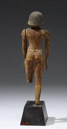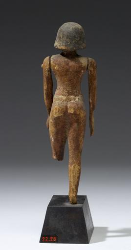 | Keywords: Egyptian - Standing Male Figure - Walters 2228 - Back.jpg This figure has been carved in the round and painted He has short hair plain black His arms are joined at the shoulders his right hand is open his left is clenched with a hole Hw has a white belt tied at the front There is a pin set into the front above the belt His left leg is broken at the knee his right foot is made separately and is gone There is a prong under his right heel inset into the base between 2119 1793 BC Middle Kingdom wood with red black and white paint H above base cm 14 7 accession number 22 28 25022 MacGregor date and mode of acquisition unknown Dikran Kelekian New York and Paris date and mode of acquisition unknown Henry Walters Baltimore 1923 mode of acquisition unknown Walters Art Museum Henry Walters Acquired by Henry Walters 1923 Label Old label 4707 H09 place of origin Egypt Walters Art Museum license Ancient Egyptian statues in the Walters Art Museum Media contributed by the Walters Art Museum needs category review |