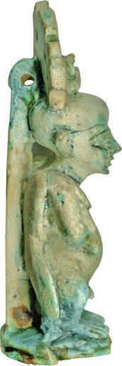 Keywords: Egyptian - Standing Pataikos - Walters 481616 - Right.jpg This dwarf-like protective deity was very popular in ancient Egypt; amulets in the shape of this god were particularly popular from the Third Intermediate period The Greek name Pataikos comes from a passage in the writings of Herodotus ca 5th century BC who used this term to describe a Phoenician protective dwarf-like image The Egyptian Pataikos is a special manifestation of the creator god Ptah and the dwarf-like appearance symbolizes his magical power This Pataikos is standing on crocodiles and has knives in his hands A large collar adorns his neck and upper chest The crown is quite unusual for Pataikos; it is an atef crown combination of the Upper Egyptian crown with flanking plumes flanked by sun-disk-crowned snakes A scarab usually on top of the head of Pataikos is instead placed in front of the lower center of the crown Wings are attached behind the shoulders of the god The back pillar is pierced to function as a loop for a pendant This was probably made during the Ptolemaic Period century 3 2 BC Greco-Roman Egyptian faience with blue-green glaze cm 6 1 2 3 1 5 accession number 48 1616 19584 Henry Walters Baltimore date and mode of acquisition unknown Walters Art Museum Henry Walters Acquired by Henry Walters Daily Magic in Ancient Egypt The Walters Art Museum Baltimore 2006-2007 place of origin Egypt Walters Art Museum license Ancient Egyptian amulets in the Walters Art Museum Ancient Egyptian faience in the Walters Art Museum Pataikos |