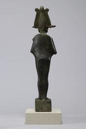 | Keywords: Egyptian - Statue of Osiris - Walters 54551 - Back.jpg The god of resurrection Osiris reigned supreme in the underworld He combined the elements of death regeneration and fertility in his mythology He was also connected with crops and the annual floods Osiris took on funerary associations when he was linked with other underworld gods as his cult spread across the land This combination of fertility and funerary aspects made Osiris the principal god of the dead One of his titles is chief of the westerners the west being the domain of the dead Here the god is shown in his standard iconography attired in a mummiform garment his hands projecting from the wrappings to hold the royal insignia of crook and flail He wears the elaborate atef crown-composed of the tall white crown double plumes ram horns and uraeus sacred cobra -as well as a ceremonial braided beard This statue is of extraordinary size ca 580 550 BC Late Period hollow cast bronze cm 60 96 14 accession number 54 551 36613 Dikran Kelekian New York and Paris date and mode of acquisition unknown Henry Walters city Baltimore Walters Art Museum Henry Walters Acquired by Henry Walters 1914 place of origin Upper Egypt Walters Art Museum license Ancient Egyptian statues in the Walters Art Museum Statues of the Egyptian late period Statues of Osiris Media contributed by the Walters Art Museum needs category review |