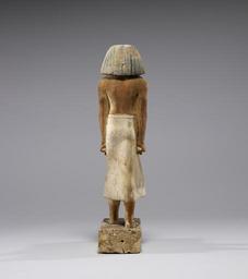 | Keywords: Egyptian - Statue of Tef-ib - Walters 2211 - Back.jpg Tombs sometimes contained more than one statue representing the owner The statues were usually inscribed with the owner's name and titles and they served as a focus for funerary rituals These examples belonging to a man named Tef-ib are unusual in that they represent the tomb owner while also bearing inscriptions referring to the four sons of Horus who protected the internal organs of the deceased These deities were also identified with the north south east and west and the statues may have been placed in the tomb in accordance with these directions The differing facial features of these statues including Walters 22 10 22 12 22 13 suggest that they were made by more than one artist Notice as well the sizes of the four figures differ as well as their wigs ca 1980 BC Middle Kingdom carved wood with polychrome paint cm 37 8 9 17 8 accession number 22 11 27426 Dikran Kelekian New York and Paris Henry Walters city Baltimore Walters Art Museum 1931 by bequest Acquired by Henry Walters 1924 place of origin Delta in Egypt Walters Art Museum license Ancient Egyptian statues in the Walters Art Museum Media contributed by the Walters Art Museum needs category review Rear views of statues |